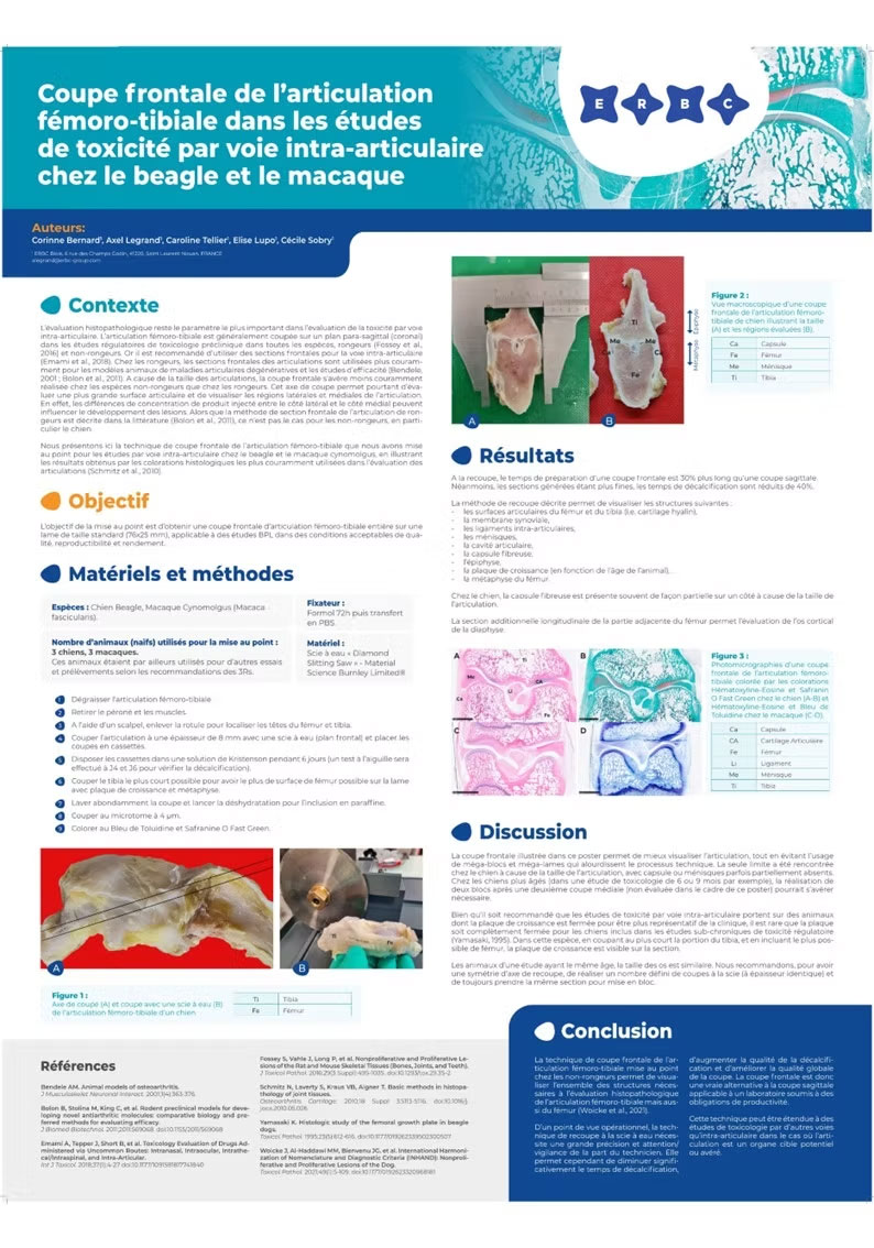 Nous présentons ici la technique de coupe frontale de l’articulation fémoro-tibiale que nous avons développée pour les études par voie intra-articulaire chez le beagle et le macaque cynomolgus, en illustrant les résultats obtenus par les colorations histologiques couramment utilisées dans l’évaluation des articulations.